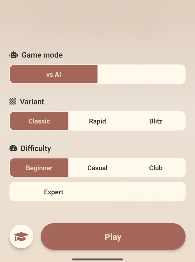 - Modes for every pace: Prefer deep, thoughtful games? Go classic with longer time controls. Want speed? Jump into rapid or blitz. Or hand the phone to a friend for a local 2-player match.