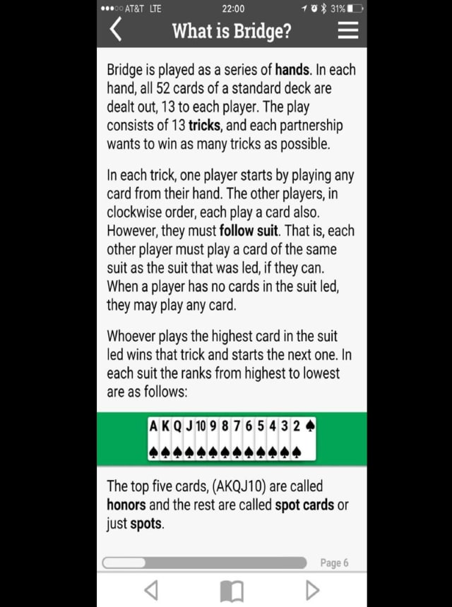 Learn what makes Bridge different from games like Hearts or Spades. You’ll get the chance to bid back and forth with a virtual partner, figuring out how many tricks you can take and deciding on the trump suit. -