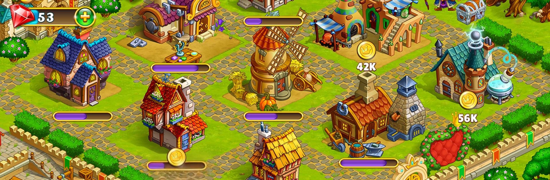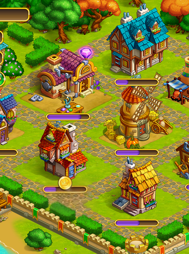 This one is an idle builder set in a bright fairy world, the kind with wizards, witches, dragons, elves, goblins, and other storybook folks wandering around asking for help. It starts small, a farm with a few plots and simple tasks, then grows into a busy town and eventually a whole little city of workshops. The loop is simple to follow. farm magical hay, mine stuff, feed it into buildings, craft shiny artifacts, and use all that to expand more buildings. Characters pop up with quests, some silly, some tied to a light story about a sleeping princess and a prince trying to break a spell, so there is always a direction without feeling bossy.