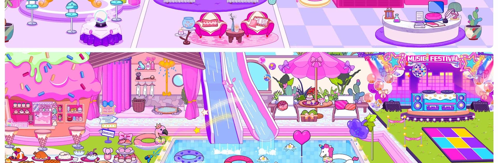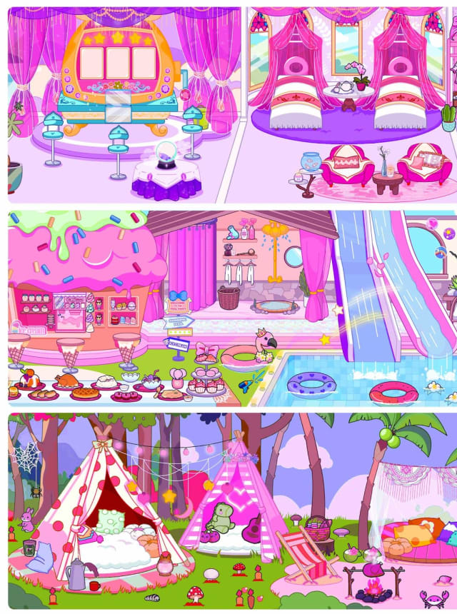 Princess Town: Doll Girl Games feels like a laid-back make-your-own-story playground. It drops the player into a cute resort that swings between spooky-cool and sunny chill. There is a vampire hotel with old charm, a luxury suite to poke around, an ice castle for skating outfits, a loud pool party, a beach and island for sun and water, and a beauty salon for facials and perfumes. The hook is the Character Creator. Players build dolls from scratch, dress them up, tweak looks, then toss them into scenes with a bunch of royal NPCs and a few elves who act like a ready-made cast. Each spot has lots of little objects to move, tap, or mix together, so stories sort of write themselves.