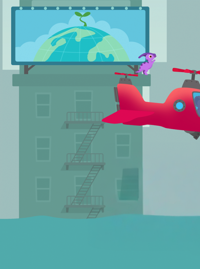 Dinosaur Helicopter Kids Games is a super simple rescue flyer where kids hop into bright little choppers and go pick up stranded dino buddies. It feels like a gentle arcade toy with big buttons and no fiddly menus. There are 12 helicopters to pick from, including a classic two-prop, a chunky military style one, and even a UFO, and they all steer with kid friendly controls. Missions are short and clear. Fly around storms, nudge past big obstacles, drop a ladder or grab things with a claw, use a goofy little bomb to clear a blocked path, then swoop in and help. The disasters are the fun kind to solve, not scary. Think earthquakes, volcano burps, flooded streets, broken railways, all drawn in bright colors with happy sound effects so it stays light. There is also a free flight mode where kids can just cruise and watch the sun come up over cities and little tropical islands.