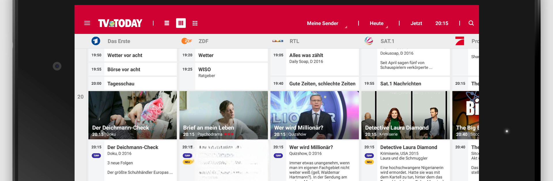 TV Today feels like a clean, no-fuss TV guide that actually helps find something worth watching instead of making someone dig for it. The start screen is built around the times that matter, with quick tabs for Now, 20:15, and 22:00, so scanning the evening is fast. There are loads of channels listed, from the big ones to niche, regional, and pay TV, and each show card has the important stuff, short description, pictures, trailer if available, and for movies there is a simple rating that says whether it is worth the time. The editorial day tips are handy too, split into films, series, documentaries, entertainment, kids, and sports, and they can include pay TV if needed.
