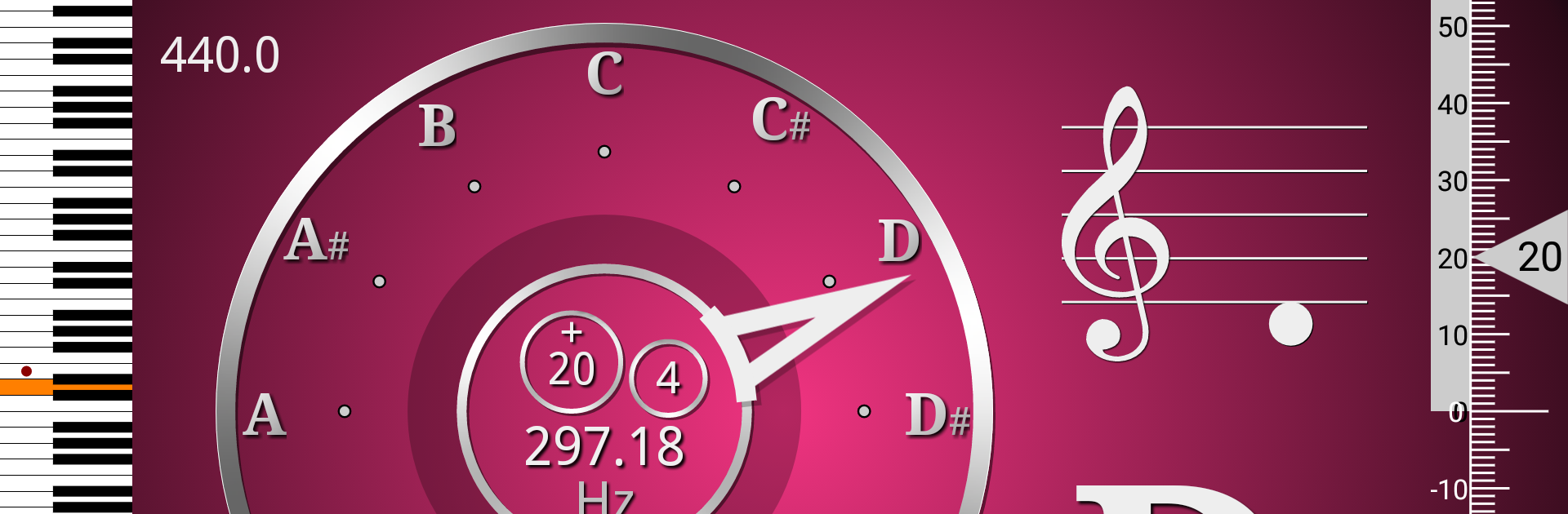 What stands out is how flexible it is without getting confusing. Colors can be changed to taste, notation works for US or Europe plus Korea, Thailand, Japan, and India, and it rotates between portrait and landscape. The aspect ratio can be tweaked so it fits weird screens nicely. There is a fine adjustment for the target range if someone tunes a little tight or loose. The app ships with tons of presets for real world use, like standard guitar, Drop D, Double Drop D, DADGAD, Open G, Open D, EAEGBE, and other open or alt setups. It covers 4 and 6 string bass, ukulele, violin, viola, cello, double bass, mandolin, mandola, and guitarelle, and the chromatic view works for things like flute, kalimba, traditional instruments, and simple vocal warmups. A pitch pipe generates accurate reference tones, and there is a tiny piano keyboard with frequency values for quick ear checks. Concert pitch can be changed off 440 Hz, and transposition is there for Bb and Eb instruments like clarinet, trumpet, and sax. There is a metronome tucked in, ads are present but removable with a small purchase, and the whole thing feels stable and quick.