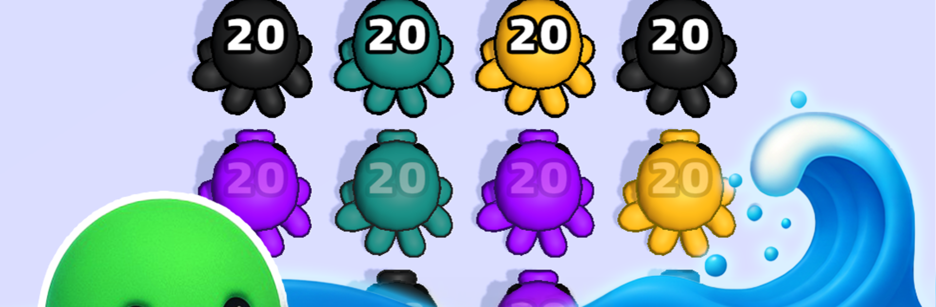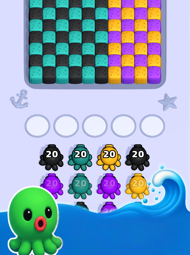 Octo Crush is a calm color puzzle about little octopus launchers and sponge tiles. The board shows a mix of colored sponges, with a few octos parked around the edges. Choose an octo that matches the color you want to clear, pull back, and let the ink fly. Match the color to pop sponges and open up lanes, keep doing that until the grid is clean. It takes a minute to learn, then the choices start to matter. Each shot has weight, so lining up a clean angle or saving a lane for later can be the difference between a tidy finish and a clogged board. The feedback feels crisp and soft at the same time, every pop looks and sounds good without being loud.