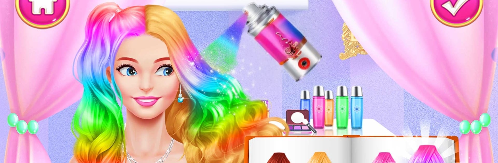 Hair Nail Salon: Makeup Games is a chill little salon sim where the player picks one of three models and goes through the whole glow-up routine from wash to wow. It starts with a spa step, rinsing and scrubbing, then a do it yourself hair mask that makes everything look soft and shiny before the real work begins. The tools feel like a tiny kit on a dresser, with scissors for snips, irons to curl or smooth things out, and spray colors that pop more than expected. It is easy to stack steps too, trim first, then add waves, then throw a bold color on the ends. Accessories matter a lot here, there are headpieces, necklaces, and earrings that pull the look together so the final photo actually feels like a fashion shot. There is a photo stage at the end, so the fresh cut and color can be saved like a mini portfolio.