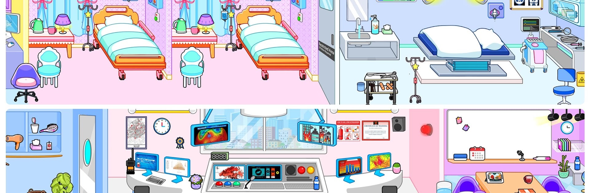 Princess Town Hospital World plays like a big digital dollhouse, only the town is packed with places to poke around in. There is a hospital to run, a clinic to set up, a police station with a car to hop into, and a fire station for those hero moments. Players pick little characters, swap outfits, and act out whatever scene sounds fun, doctor and patient, firefighter and rescue, parent and baby, even a chill day at home with dolls. Nothing is rushing anyone, there are no scores or fail screens, just drag stuff around, discover tiny interactions, and build a story that keeps changing. The sound design leans into soft beeps, taps, and ASMR style effects, which makes the whole thing feel surprisingly calm.