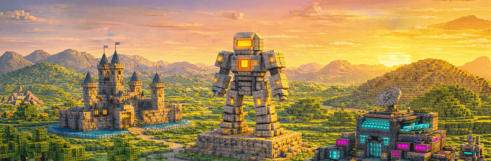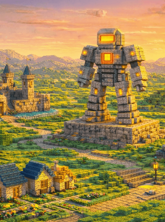 - Go big with mechs and sci‑fi style: Design towering mech statues, clanky walkers, and glowing tech installations that give your world a sleek, futuristic vibe.