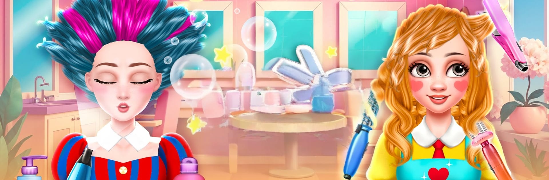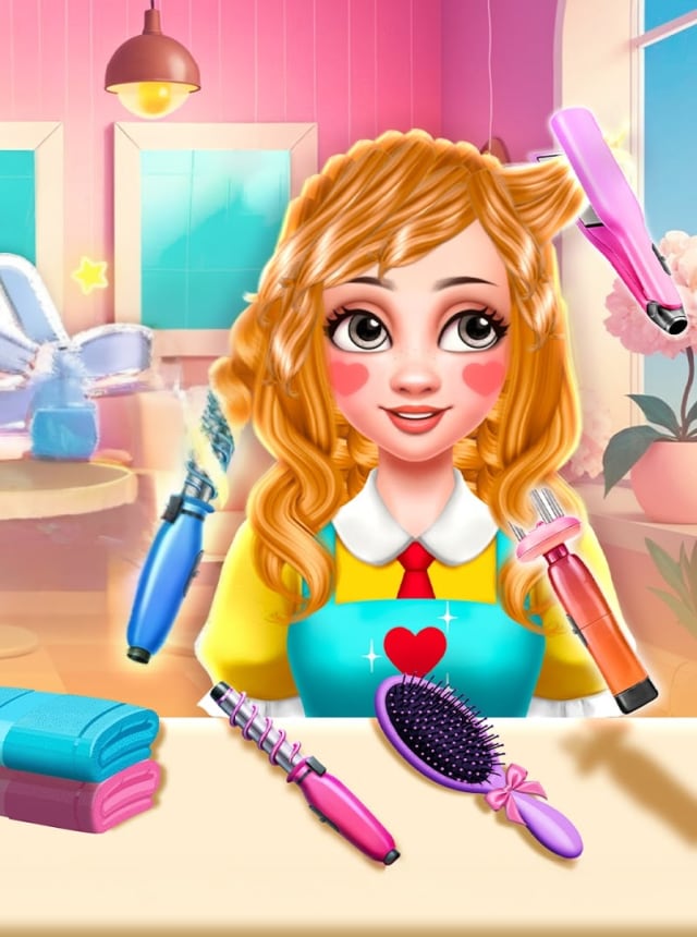 Hair Salon: Hair Cut Makeover plays like a laid back creative kit where the whole fun is messing with hair and seeing what wild style actually works. It rotates through characters, sometimes a regular client, sometimes a princess type, and hands over a full set of salon tools. Scissors, trimmers, a blow dryer, curlers, straightener, the usual comb and spray bottle, then the dye station for highlights or full color swaps. Colors are not shy, there are soft pastels and bright neon shades, so it is easy to go classy or cartoon bold. There is a quick spa bit too, washing and face care to clean things up before styling, then a dress up step with outfits, hats, bows, and shiny accessories to match the hair. It feels low pressure, almost toy-like, and it encourages experimenting because nothing feels permanent and mistakes do not really sting.