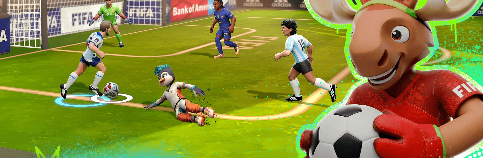 - Arenas with attitude: Rooftop neon courts, icy fields, even a shimmering rainbow pitch—each location changes spacing, flow, and tactics.