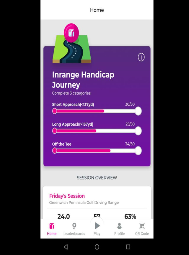 Earn your personal Inrange Handicap™ as you play. It’s not just another number on a screen—it updates in real time based on how you’re performing across drives, approach shots, and more, so you’re always working at your level. -