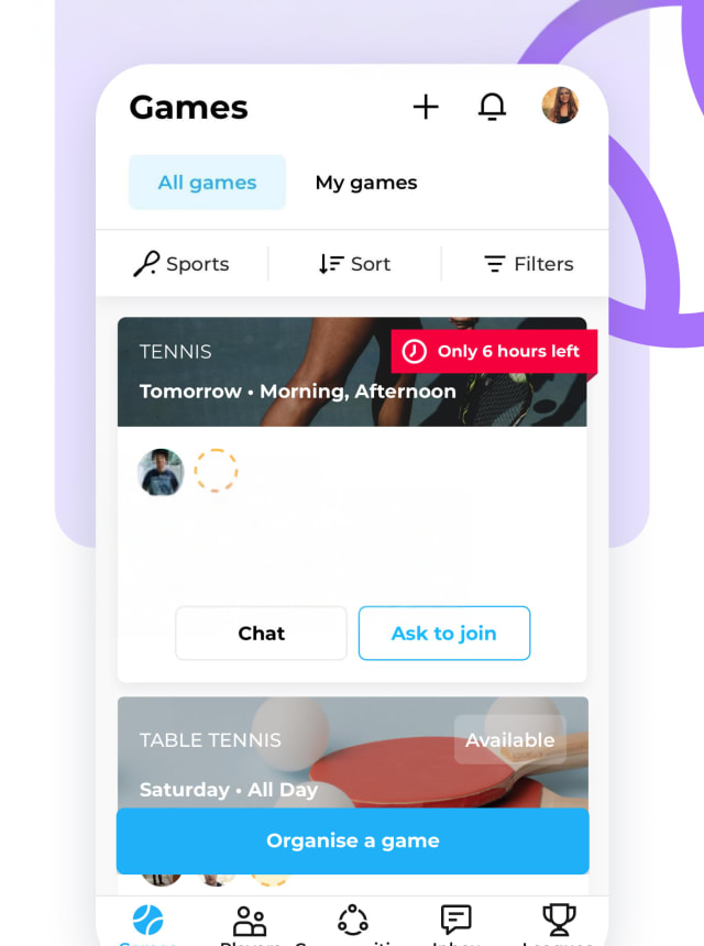 - All the racket sports: Tennis, badminton, squash, table tennis, and padel—keep all your games in one place.