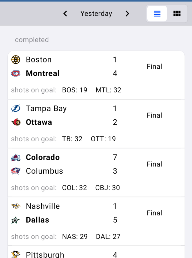 - Instant alerts: Get notified for puck drop, final horn, score changes, lead swings, overtime, power plays, and more—all on your terms.
