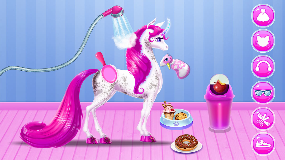 Um die Rolle eines Pferdepflegers und die damit verbundenen Aufgaben besser zu verstehen, ist es am besten, in diesem Einhorn-Spiel selbst zu lernen, wie man ein glückliches und gesundes Pferd pflegt. Und wie genau? Ganz einfach: Stell dich den Herausforderungen und stelle sicher, dass jede einzelne gemeistert wird, damit dein Geld und deine Erfahrungspunkte steigen. Ja, richtig gehört! Du kannst Münzen verdienen, mit denen du deinem kleinen Einhorn alles kaufen kannst, was du möchtest. Symbole zeigen dir außerdem seinen Gesundheitszustand und seine Stimmung an. Sein Glück liegt in deinen Händen. Als Erstes säuberst du beim Spielen mit dem Einhorn seinen Stall vom angesammelten Schmutz. Sobald sein Zuhause sauber ist, ist auch er an der Reihe und du musst ihm mit all deinen Werkzeugen eine Freude machen. Weil du dich um ihn kümmerst, bringst du ihn zum Hufschmied, um seine Hufe zu pflegen. Dabei durchläufst du einen ganzen Prozess, um sie zu pflegen. Pass auf! Es gibt sogar ein Erntespiel, bei dem du Äpfel und Wasser in einem Eimer sammeln musst, um ihm eine gute, gesunde Mahlzeit zuzubereiten. Als Nächstes musst du das nächste Level freischalten und sein Zuhause dekorieren, ihn mit schönen Accessoires ausstatten, ihn zur gründlichen Untersuchung zum Arzt bringen, ihm eine Gesichtsbehandlung und Make-up anbieten. Es gibt auch interaktive Spiele, und wie du siehst, wird die Komplexität des Spiels dich dazu anregen, so oft wie möglich zu spielen. Dafür belohnen wir dich mit täglichen Preisen wie Geschenkboxen und dem Glücksrad. Außerdem gibt es lustige Minispiele und ein spannendes Pferderennen, bei dem du noch mehr Geld gewinnen kannst. Dein Ziel ist es, Erfahrung als Einhornpfleger zu sammeln und Spaß daran zu haben, die Bedürfnisse dieses süßen Tieres zu erfüllen. Dieses Ponyspiel bietet alles, was Sie sich gewünscht haben, und sogar noch mehr: Die Funktionen sind exorbitant und die Art und Weise, wie die Grafik mit der Thematik harmoniert, ist erstaunlich.