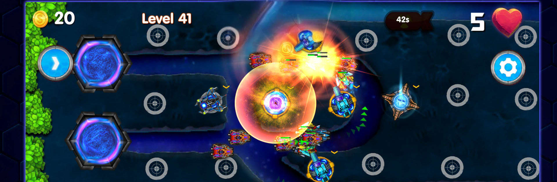 Tower Defense Zone is a straight-up classic tower defense game, the kind where enemies run along set paths and the player drops towers to stop them. Gold comes from each creep destroyed, so the early waves matter a lot, since that income decides how fast the build ramps up. There is a short build window at the start, then waves roll in faster and tougher, and it is not shy about throwing a surprise or two. What really stands out is the boss tanks. There are a few types, they hit hard, and they can actually wreck placed towers if they slip through. That twist forces careful placement at choke points and keeping a little gold ready to rebuild or upgrade under pressure, which keeps the hands busy in a good way. There are 11 maps with different paths, 11 missions to clear, and 6 tower types that fill the usual roles, splash, slow, single-target damage and so on, with more than 20 enemy types that mix speed and armor.