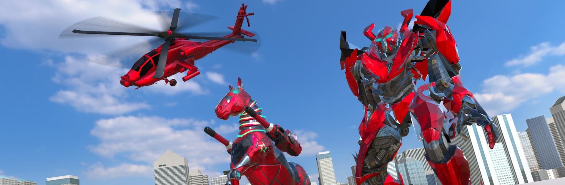 Super Horse Robot Transform: Flying Helicopter plays like an arcade mashup of mech brawler, animal robot, and simple air combat. The whole hook is swapping between a metal horse that sprints and kicks through streets and a gunship helicopter that hovers over the city and blasts enemy bots. Missions drop the player into short objectives with timers, like clearing waves, chasing fast drones, or popping a mini boss before the streets get wrecked. Combat feels punchy in a Saturday-morning way: quick punches and flying kicks on the ground, then missiles, minigun bursts, and strafing runs when airborne. Enemies shoot back often, so dodging matters and switching forms at the right moment keeps things moving. The city is a bright playground of wide roads and rooftops, not super complex, but it gives enough space to swoop down, land, clean up a skirmish, then lift off again.