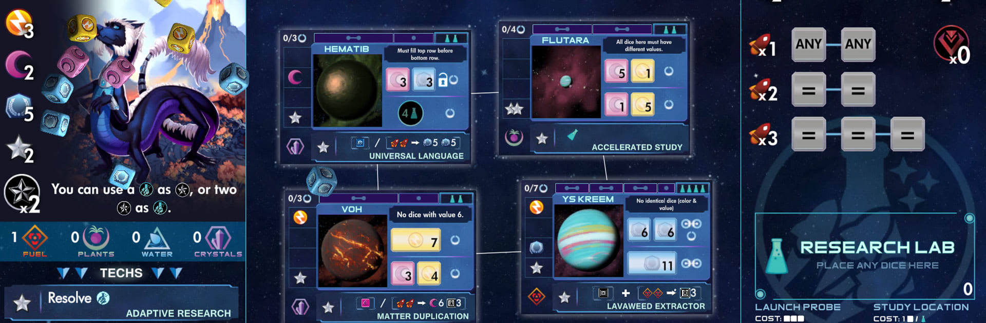 Grow, Research, Expand: Establish colonies for more resources (and more dice!), unlock new tech, study locations, and send probes to push your science forward.