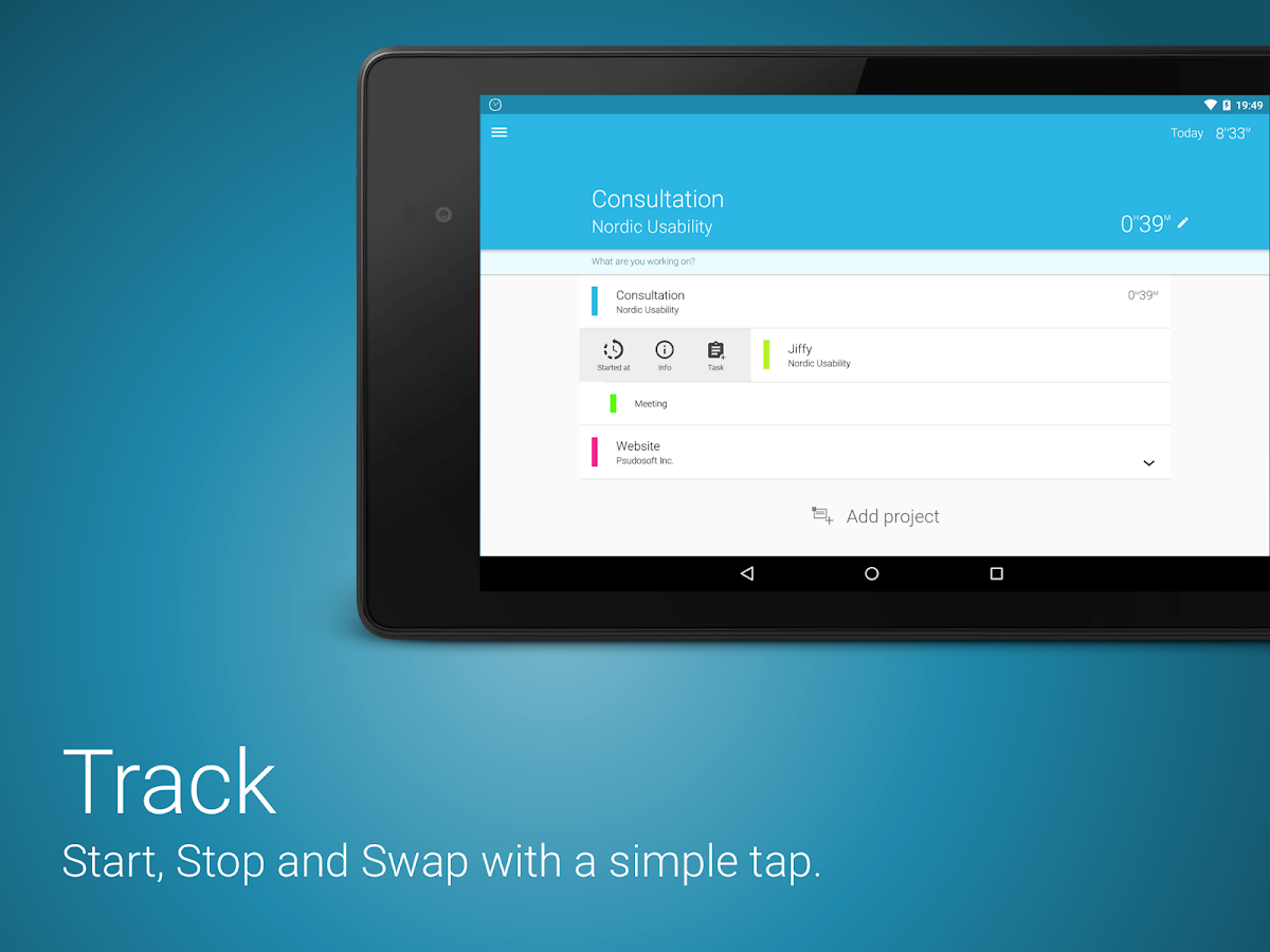 Dengan merekam sepanjang waktu bekerja, pelacakan tanpa kesalahan membuat majikan senang dan memberi tahu Anda kapan saatnya untuk mengalihkan fokus ke waktu luang. Anda bekerja keras dan waktu bersama keluarga diperoleh dengan baik. Jiffy memungkinkan Anda membuktikan efisiensi itu, untuk waktu senggang yang tak tertandingi.