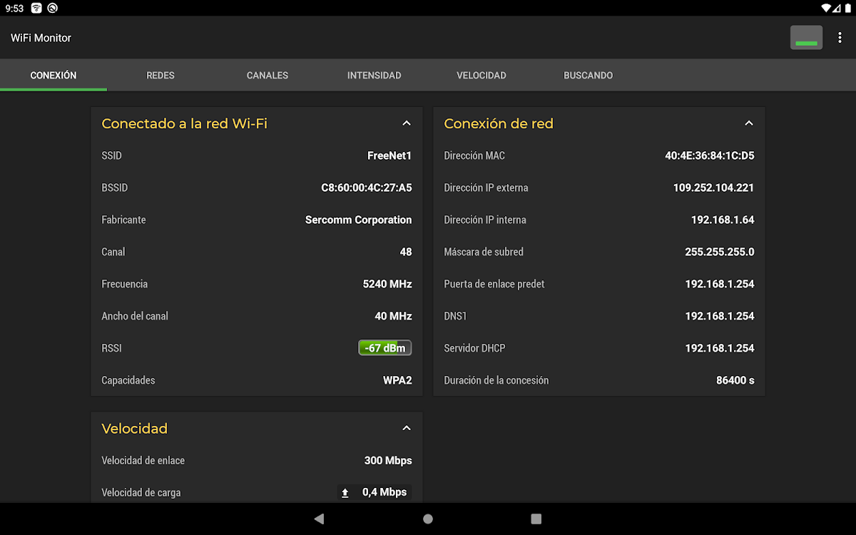 La pestaña «Conexión» muestra información sobre el punto de acceso wifi conectado: