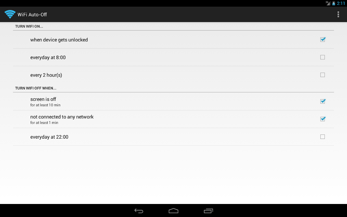 Außerdem gibt es Optionen zum automatischen Einschalten des WLANs, zum Beispiel sobald das Gerät entsperrt wird, zu bestimmten Uhrzeiten oder beim Betreten bestimmter Orte (letzteres nutz Mobilfunkzellenortung und funktioniert daher nur auf Geräten mit Mobilfunkverbindung). Dadurch ist die WLAN-Funktion immer eingeschaltet, wenn das Gerät verwendet wird.