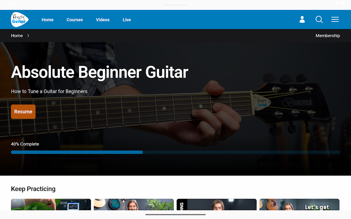 L'application Andy Guitar est un excellent moyen d'accéder aux leçons vidéo, aux cours et à d'autres supports disponibles sur le site Web d'Andy Guitar. Si vous avez un compte sur le site Andy Guitar, vous pouvez vous connecter avec les mêmes informations et tout votre contenu est parfaitement synchronisé sur le site et vos appareils.