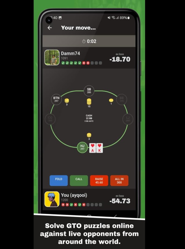 GTO Battle+ : Poker Puzzles 比起普通撲克遊戲帶來的運氣成分,更多在挑戰玩家對數學、機率還有策略的掌握。對那些想用遊戲方式快速檢驗自己實力、又想邊玩邊學的人,會是挺合胃口的一款選擇。進去就是解一題題撲克難題,然後再跟世界各地玩家比拼誰能做得更接近最佳解法。整體來說很乾脆,想隨時開局就能玩,朋友群裡也會多個討論話題。如果熟悉撲克的規則,又想訓練腦袋,這遊戲玩起來會很自然、有挑戰性,不會有壓力又能一直進步。